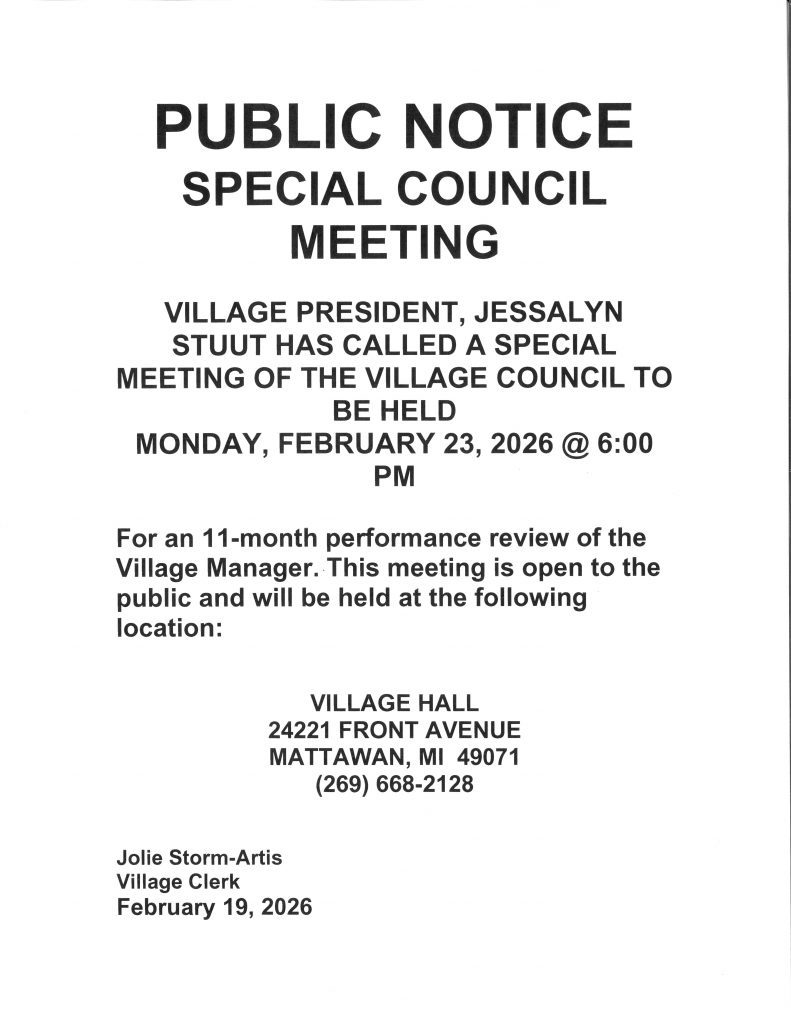 Village offices are open to the public. You may call 269‑668‑2128 or email us at offices@mattawanmi.com for an appointment, if you prefer.