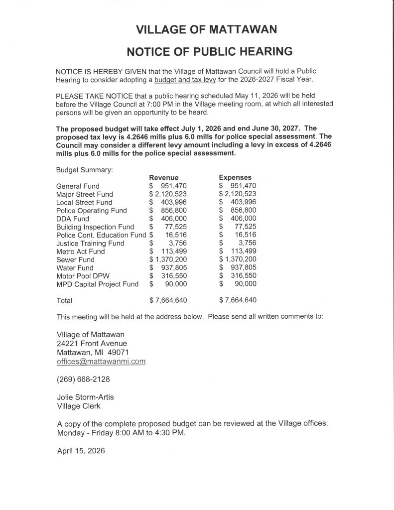 The Village of Mattawan offices will be closed Wednesday, April 15 from 10:30 AM to 12:30 PM for training. Emergency water and sewer services and Mattawan Police Department will maintain normal operations. Please contact the Village Office with any questions at (269) 668-2128 or offices@mattawanmi.com.