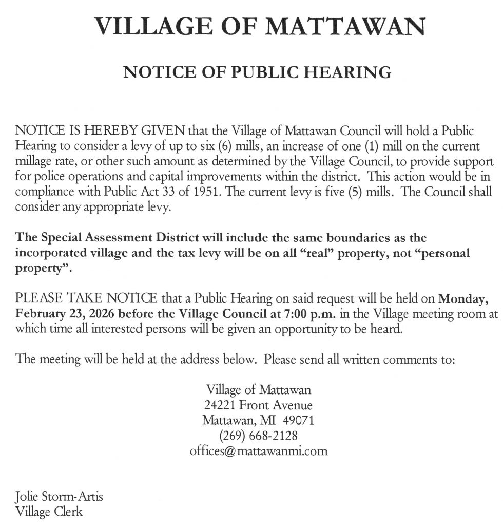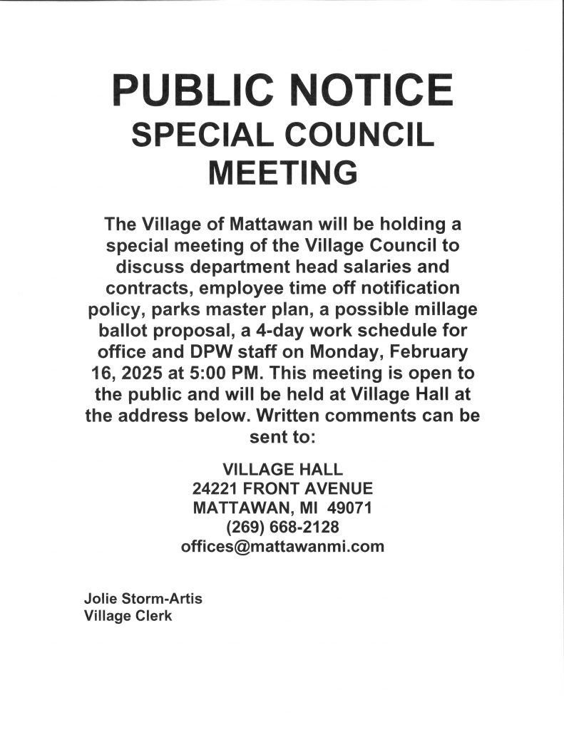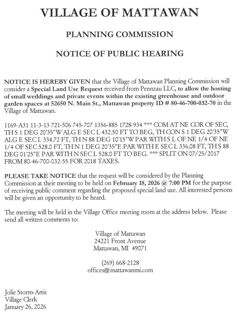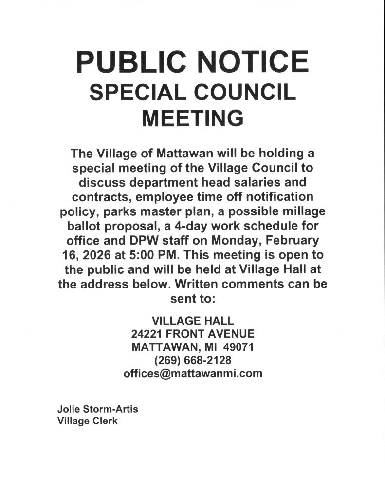 Village offices are open to the public. You may call 269‑668‑2128 or email us at offices@mattawanmi.com for an appointment, if you prefer.