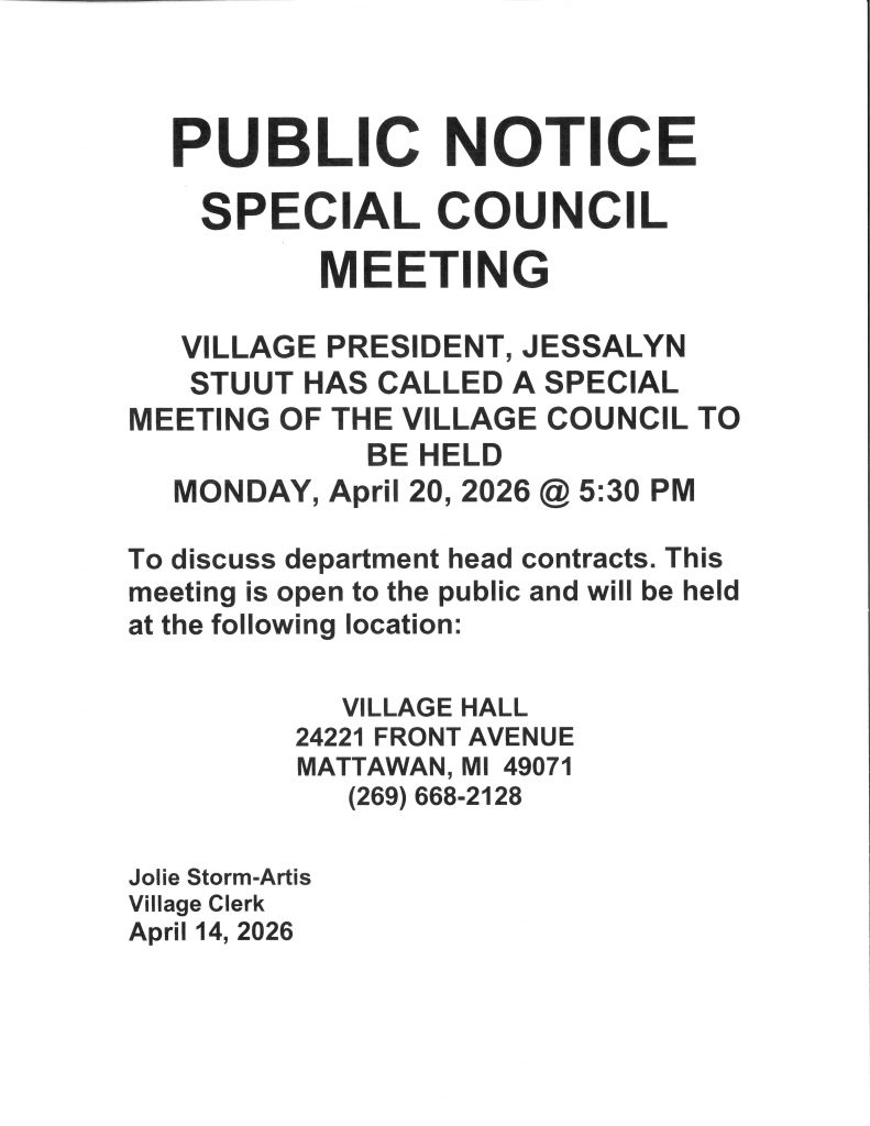 The Village of Mattawan offices will be closed Friday, April 3, 2026 for the Good Friday Holiday. Emergency water and sewer services and Mattawan Police Department will maintain normal operations. Please contact the Village Office with any questions at (269) 668-2128 or offices@mattawanmi.com.